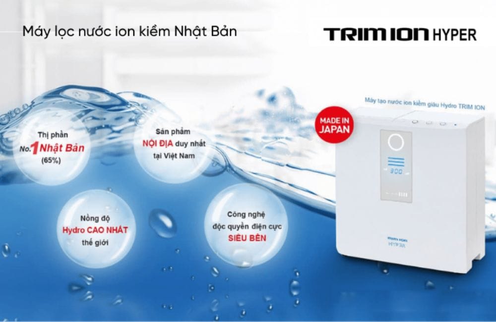 Nước ion kiềm Trim Ion là loại nước được tạo ra từ máy lọc ion kiềm Nhật Bản Trim Ion. Loại nước này có pH 8.5–9.5 giúp trung hòa môi trường axit trong cơ thể, ORP âm khoảng -200 đến -400mV giàu hydro hoạt tính có khả năng hỗ trợ chống oxy hóa mạnh, và cấu trúc phân tử nước nhỏ hơn giúp dễ thẩm thấu vào tế bào, tăng hiệu quả hydrat hóa và hỗ trợ hoạt động tế bào tốt hơn.