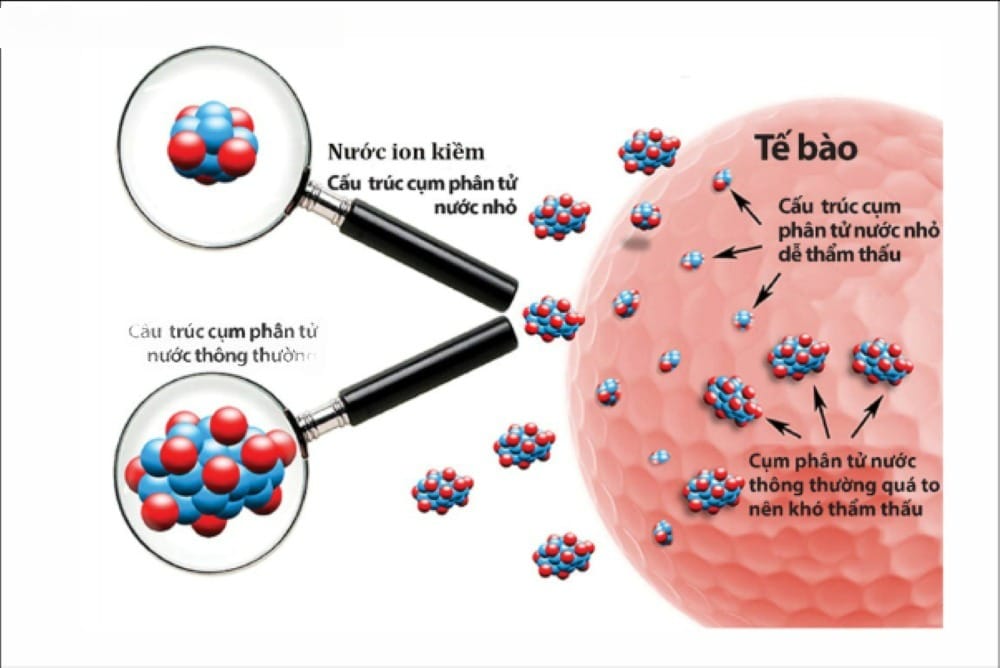 Các phân tử nước Kangen có cấu trúc siêu nhỏ (micro-cluster) giúp nước thẩm thấu nhanh vào tế bào, mang theo oxy và dưỡng chất, đồng thời đẩy độc tố ra ngoài qua mồ hôi, nước tiểu và hệ bạch huyết.